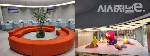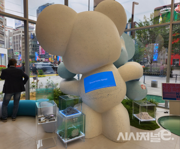 1층에 들어서면 친환경 의미를 담은 ‘허그 베어’를 만날 수 있다. 포토존으로 활용되는 허그 베어는 재생 플라스틱 소재로 제작한 조형물로 자원 순환과 지속 가능성이란 의미를 담았다. 모바일 서비스 센터가 입점한 지하 1층은 소파와 의자를 구비해 소비자들의 휴식 공간으로 조성했다.