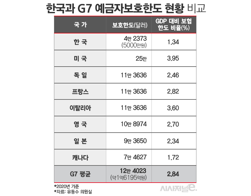 한국금융학회 교수진 12명의 연구에 따르면 예금자보호한도를 5000만원에서 1억원으로 확대할 경우 저축은행 예금이 최대 40% 증가하는 것으로 추정하고 있다. 예금자보호한도란 금융사가 영업정지나 파산 등으로 예금자에게 예금을 돌려줄 수 없게 됐을 때 예금보험공사가 금융사 대신 지급해주는 예금의 최대 한도다. 금융회사별로 1인당 5000만원을 적용 중이다. 지난 2001년부터 적용된 보호한도는 현재까지 23년째 이어지고 있다.