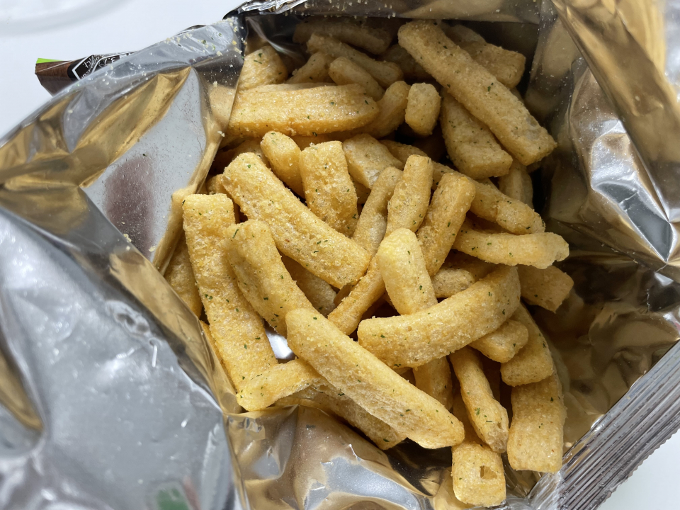 기대감을 안고 먹태깡 봉투를 뜯으니 건어물 안주 같은 약간은 비릿한 향이 확 올라왔다. 모양은 납작하면서도 길쭉한 스틱 형태로 언뜻 과자 '포스틱'과 비슷하다. 색깔은 전반적으로 먹태와 같이 누르스름한 색으로, 곳곳에 청양고추를 연상케 하는 초록색 점들이 콕콕 박혀있다.