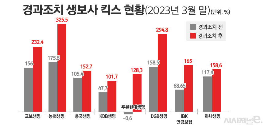 경과조치를 적용하지 않으면 킥스가 당국의 권고치를 겨우 넘기거나 만족시키지 못한 경우는 주로 생보사에서 나타났다. 농협생명 외에 대형사 가운데선 교보생명이 156%로 당국의 권고치를 가까스로 넘겼지만 경과조치 적용으로 232.4%를 기록했다. 흥국생명은 원칙대로 산출하면 당국 권고치를 크게 밑도는 105.4%를 기록했지만 경과조치 후엔 152.7%로 올랐다.