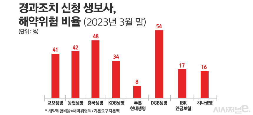 실제로 농협생명의 올해 3월 말 기준 해약위험액은 2조260억원으로 전체 위험액의 42%를 차지했다. 금리위험액 다음으로 많은 규모다. 교보생명의 해약위험액은 3조7326억원(41%)으로 전체 위험액 중 가장 컸으며 흥국생명도 1조549억원(48%)으로 가장 많았다. 중소형사 중에선 KBD생명은 5313억원(34%)으로 두 번째로 많았고, DGB생명(54%)은 3120억원으로 가장 많았다. IBK연금보험, 푸본현대생명, 하나생명은 전체 위험액 가운데 해약위험이 차지하는 비율은 낮았지만, 규모 자체는 금리위험액 다음으로 많은 것은 마찬가지였다.