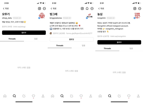 농심, 빙그레, 오뚜기 등 식품업계에서도 공식 계정을 개설하고 나섰다. 하지만 아직 게시물을 올리지 않고 상황을 지켜보고 있다. 공식적으로 활동을 시작하지 않았기에 구독자수는 200~5000명 사이로 무신사·CJ올리브영에 비해 적다.