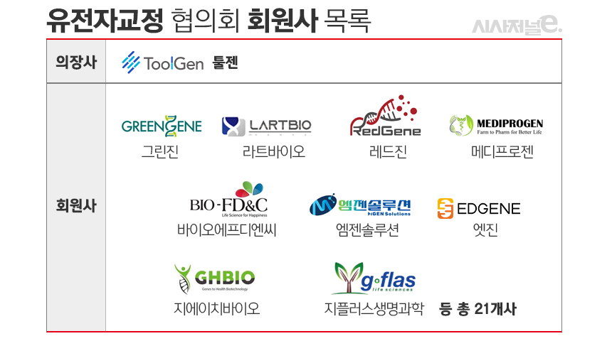 회장사로는 툴젠이 선임됐다. 툴젠 외 그린진, 라트바이오, 레드진, 메디프로젠, 바이오에프디엔씨, 엠젠솔루션, 엣진, 지에이치바이오, 지플러스생명과학 등 총 21개 기업으로 협의회가 구성됐다.