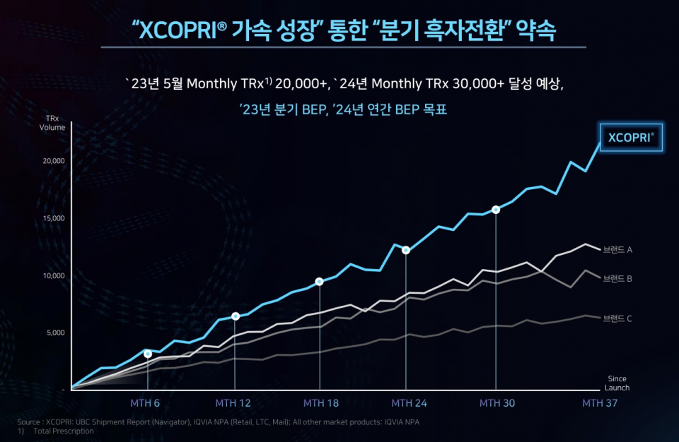 현재 미국에서 엑스코프리는 점유율 2위를 기록하고 있다. 1위는 UCB의 3세대 뇌전증 치료제 ‘브리비액트’다. SK바이오팜은 엑스코프리가 곧 경쟁제품을 넘어서 시장 점유율 1위이자 뇌전증 적응증에 총 처방수가 가장 많은 제품이 될 것이라 전망했다.