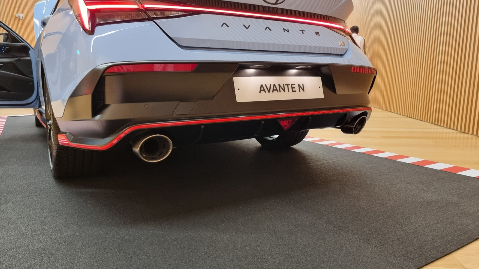 먼저 전면부는 기존 아반떼와 비교해 블랙 트림부를 확대하고 외장 칼라 가니쉬를 더해 한층 더 낮은 자세로 완성했다. 또한 범퍼 디자인이 기존 보다 더 굵은 선으로 이루어져 역동적이면서도 강인한 인상을 풍긴다. 그릴 상단부에는 ‘N’ 로고도 추가했다.