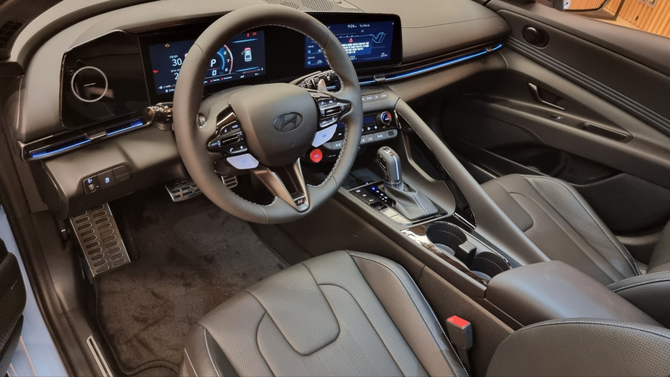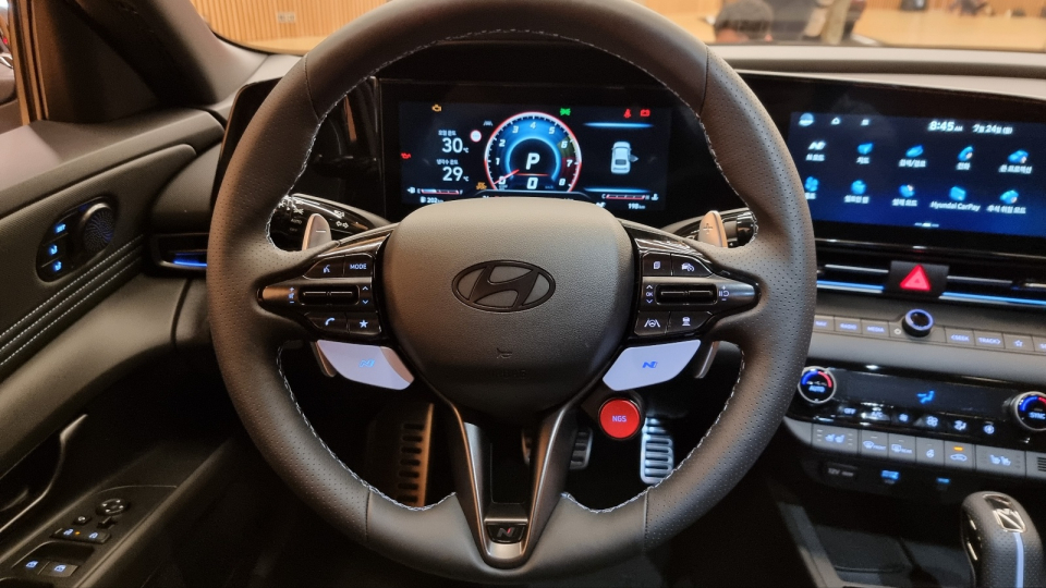 실내는 곳곳에 N 전용 로고를 적용했으며 스포츠 바켓시트와 N 전용 기어노브 등을 통해 고성능차 느낌을 강조했다. 또한 운전대 하단부에는 일종의 ‘부스터’ 역할을 하는 빨간색 ‘N그린 시프트(NGS)’ 버튼이 있어 순간출력을 높일 수 있다.