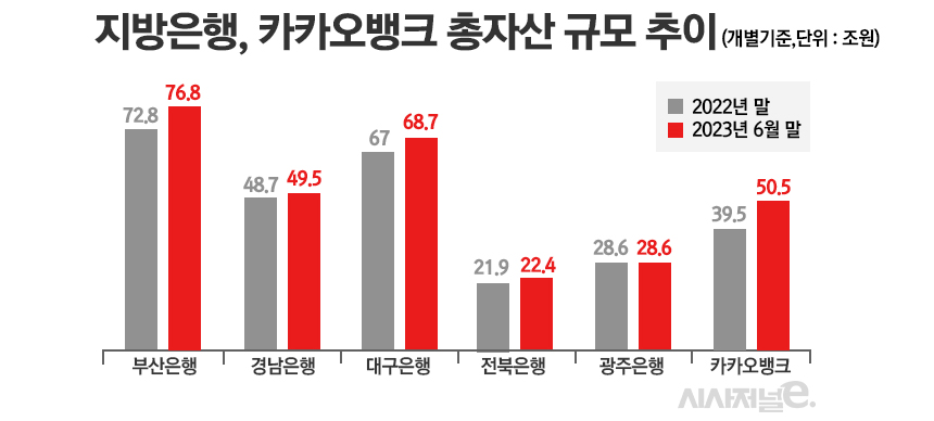 [시사저널e=유길연 기자] 카카오뱅크가 올해 상반기 자산규모가 지방은행 3위인 BNK경남은행을 추월하는 등 몸집을 불리고 있다. 주택담보대출을 크게 늘리는 등 대출 포트폴리오 다각화 전략이 주효한 결과다. 그러나 최근 지방은행도 주담대 금리를 크게 낮추는 등 대응전략을 마련한 만큼 하반기에 카카오뱅크와 지방은행의 대출자산 확보를 위한 경쟁은 더 치열해질 것으로 전망된다.