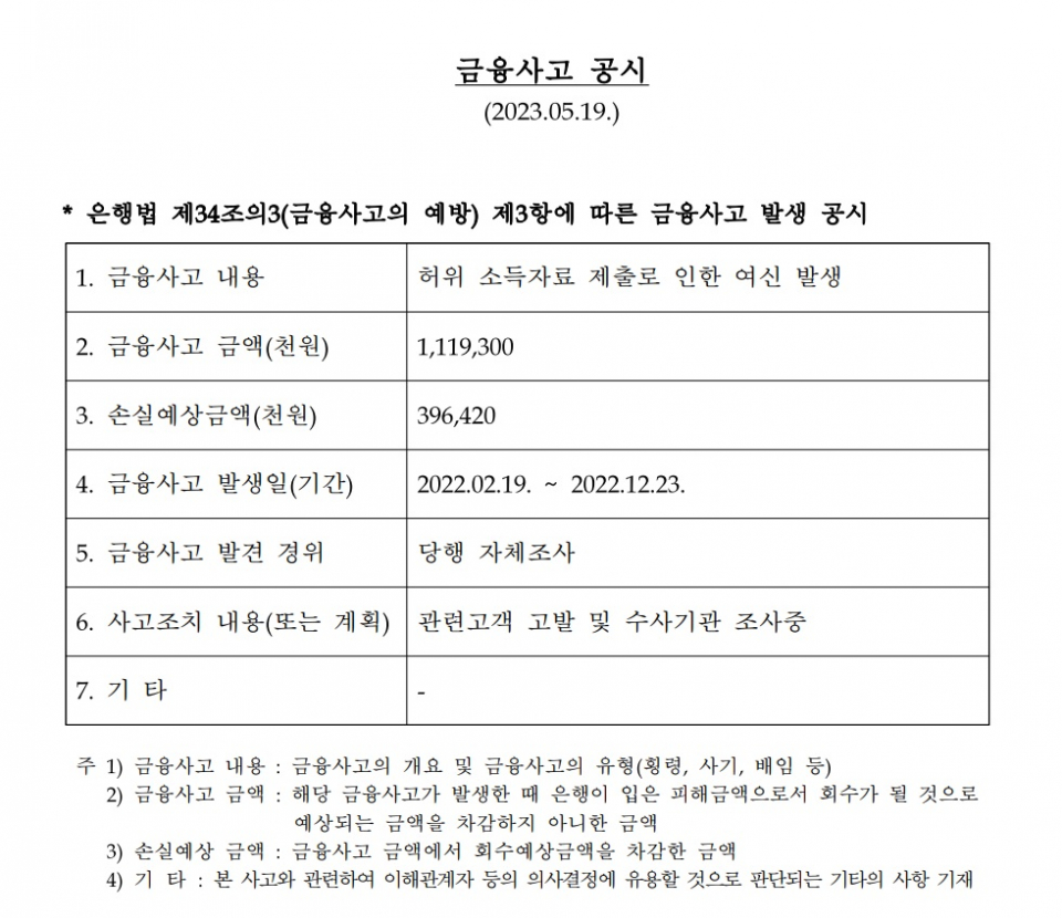 실제 횡령 사고는 아니지만 최근 케이뱅크에서는 비슷한 금융 사고가 발생한 사례도 있다. 지난 5월 케이뱅크는 '허위 소득자료 제출'을 통한 11억원대 규모 대출사기 금융사고가 발생했다고 공시했다. 사고 유형은 일명 작업대출 사기로 지난해 2월부터 12월까지 10개월에 걸쳐 불법적으로 대출금을 가로챈 혐의다. 인터넷거래에 전문화된 시스템을 갖춘 인터넷전문은행에서 서류 조작만으로 대출사기 금융사고가 발생한 점에서 전반적인 내부 점검이 필요하다는 지적이 나온다.
