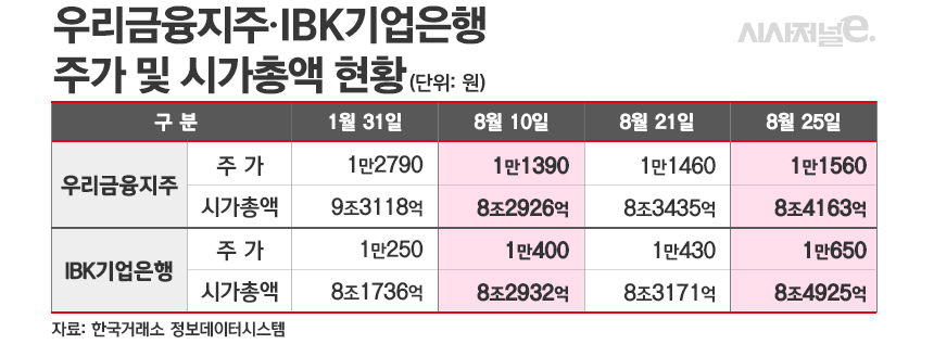 IBK기업은행, 8월 들어 우리금융지주 시총 종종 추월