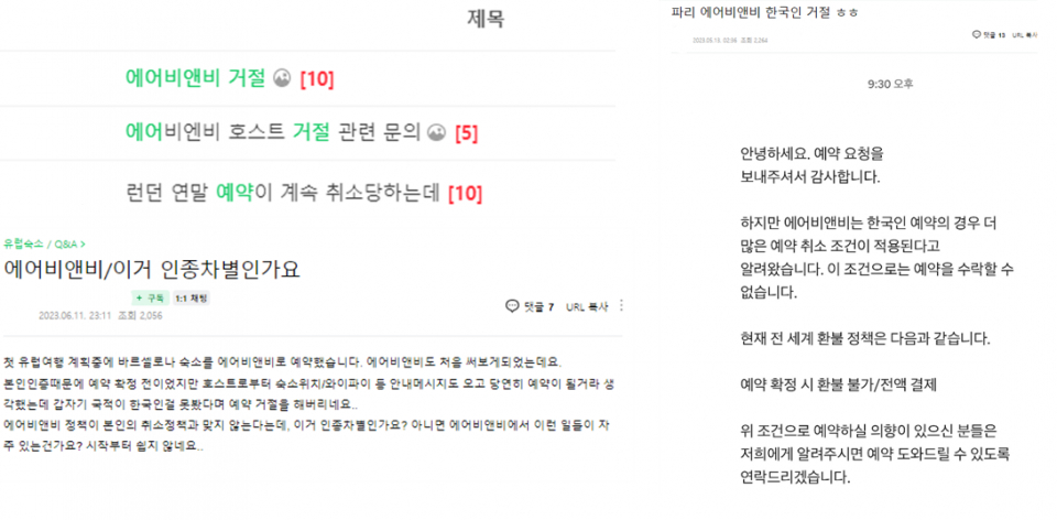 그러나 최근 호스트들이 게스트가 한국인이라는 이유로 예약을 거절하는 경우가 늘고 있다. 여행 관련 온라인 커뮤니티인 '유랑'에서는 올해 초부터 '에어비앤비 거절' '파리 에어비앤비 한국인 거절' '에어비앤비 예약이 안 된다는데 무슨 뜻이냐' 등 비슷한 사례를 적은 글이 계속해서 올라오고 있다.