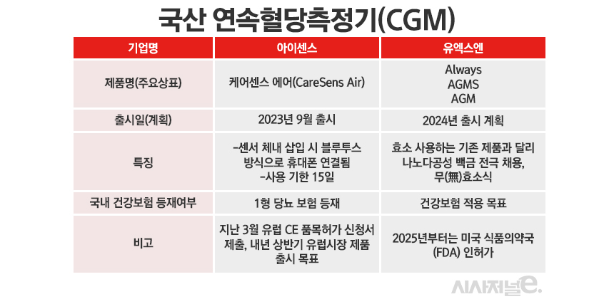 12일 제약·바이오 업계에 따르면 국내 기업이 독자적 기술을 적용한 CGM 개발에 나섰다. 아이센스는 지난 10일 CGM ‘케어센스 에어’를 국내 시장에 출시했다. 첫 국산 연속혈당측정기 제품의 등장이다. 유엑스엔은 이르면 내년 상반기 국내에 제품을 선보이겠다는 목표다.