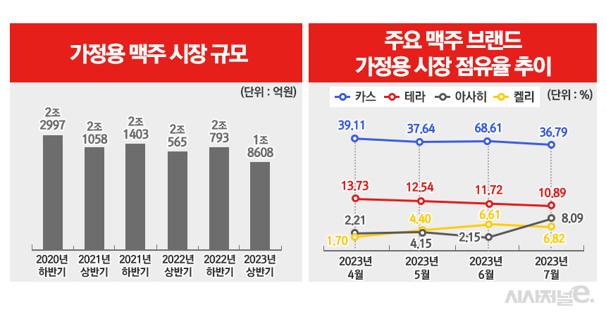 가정용 시장은 2020년 하반기부터 그 규모가 축소되고 있다. aT 식품산업통계정보에 따른 맥주 소매점 매출은 2020년 4조3700억원, 2021년 4조2400억원, 2022년 4조1300억원으로 감소했다. 또 지난해 상반기 2조500억원에서 올해 1조8000억원대로 9%가량 규모가 줄었다.