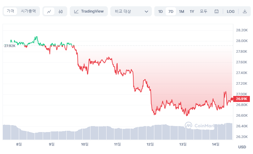 14일 글로벌 가상자산 시황사이트 코인마켓캡에 따르면 이날 오전 11시 비트코인은 2만6919달러(약 3648만원)로 1주일 전과 비교해서 3.57% 크게 하락했다. 지난 주말 2만8000달러에 육박하던 비트코인은 10일부터 내려가기 시작했다. 그러더니 12일 2만7000달러 선이 무너지더니 2만6620달러까지 떨어졌다. 이후 소폭 올라 2만7000달러 부근에서 거래됐다.