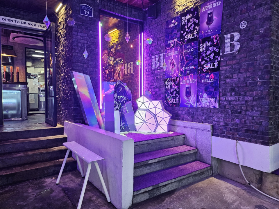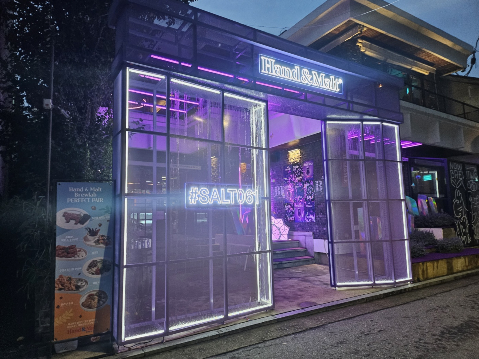 용산 핸드앤몰트 브루랩은 외관부터 보라빛 전등으로 독특한 분위기를 자아냈다. 영문으로 적힌 '#SALT 061' 글자가 멀리서도 눈에 띄었다. 내부는 솔트 061 홍보 포스터와 한정판 솔트061 캔맥주 등으로 꾸며져 있었다.