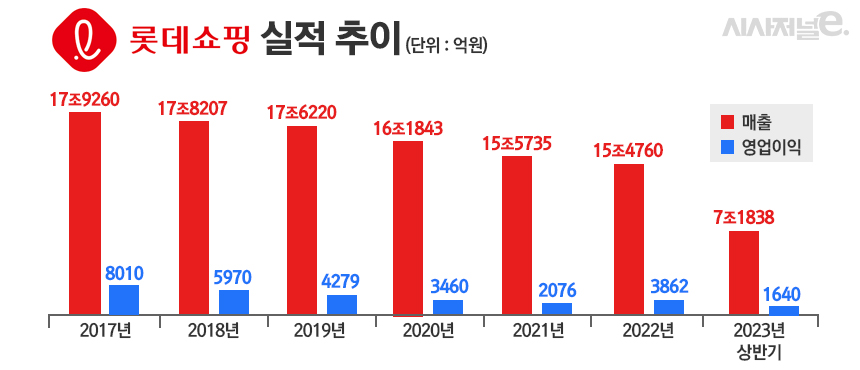 롯데 유통부문은 지난 2017년부터 지난해까지 계속해서 실적이 감소했다. 2017년 롯데쇼핑의 매출은 17조9260억원으로 18조원에 가까웠지만 지난해에는 15조4760억원에 그쳤다. 영업이익도 2017년 8010억원에서 지난해 3862억원으로 반토막이 났다.