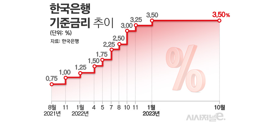 [시사저널e=김태영 기자] 한국은행이 올해 들어 6회 연속 기준금리를 동결했지만 시중은행 대출금리는 연일 상승세를 이어가고 있다. 미국발(發) 긴축 장기화 여파로 금융채 등 시장금리가 들썩이면서 시중은행 주택담보대출(주담대) 최고금리는 9개월 만에 다시 연 7%를 넘어선 상태다. 주담대 금리가 연내 8%대를 돌파할 것이라는 전망까지 나오는 가운데 고정금리와 변동금리를 놓고 어떤 쪽을 선택할지에 대한 차주들의 고민이 깊어지고 있다. 현재로서는 고정금리가 변동금리보다 유리하지만 고금리 상황 속 기준금리는 멈춰 있고 장기적으로는 금리 상승 흐름이 끝날 것이라는 관측도 나와 유불리 판단이 복잡해졌다는 분석이 나온다.