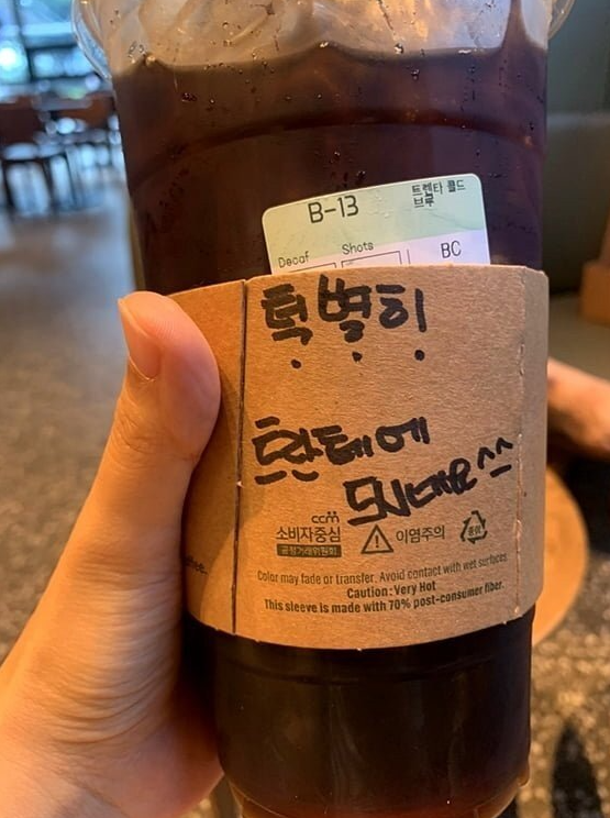 글쓴이 A씨는 "남편 턱이 큰 편이다. 마감시간 30분 전에 들어갔는데 저런 멘트를 적어줬다"며 '턱별히 트란테에 드시네요'라고 적힌 커피 슬리브(컵홀더) 사진을 함게 올렸다.