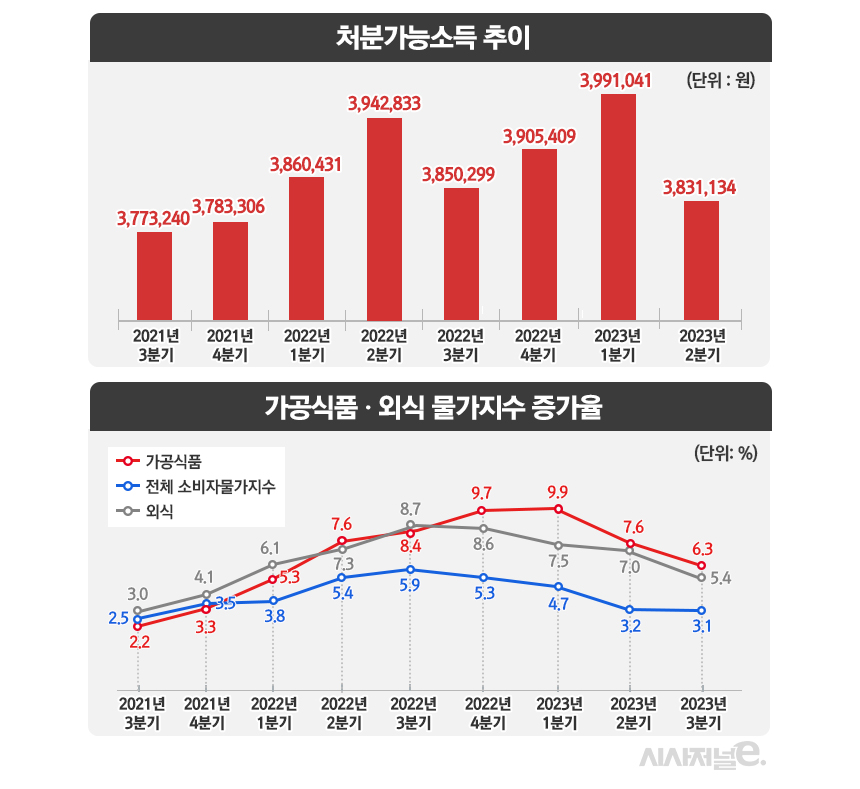 24일 통계청 국가통계포털에 따르면 올해 2분기 가구 소득은 감소하고, 먹거리 물가는 올랐다. 지난 2분기 전체 가구의 처분가능소득 전년 동기 대비 2.8% 줄고, 대표적인 먹거리 지표인 가공식품과 외식물가는 7% 이상 올랐다.