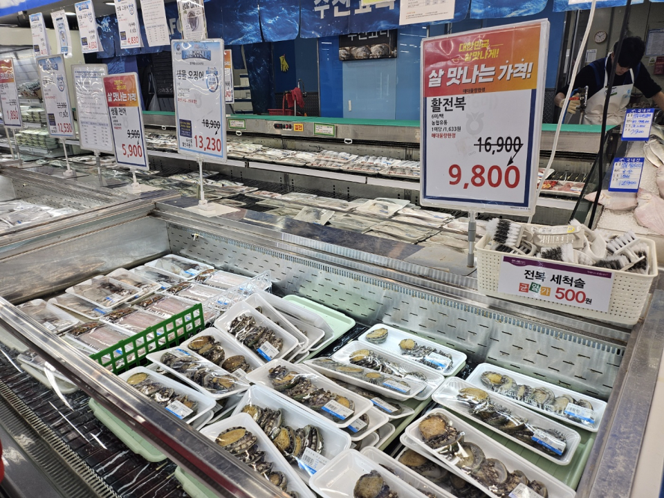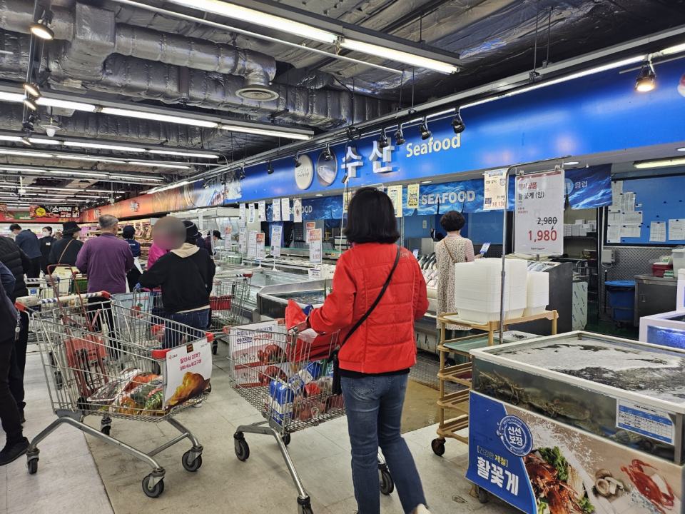 수산물코너에서는 ‘대한민국 수산대전’ 행사가 진행되고 있었다. 올해 1월 시작된 대한민국 수산대전은 정부가 예산을 사용해 온·오프라인 유통사의 일부 수산물을 할인하는 행사다. 행사를 통해 오징어, 갈치 등이 할인가격에 판매되고 있었다.