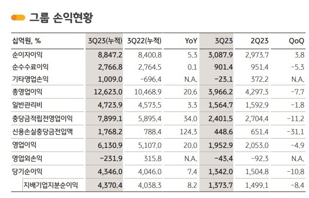 다만 3분기 순익 자체는 1조3737억원으로 직전 분기(1조4991억원) 대비 8.4% 줄었다. 금융시장 변동성 확대로 유가증권 관련 이익이 감소한 영향이다. 또 KB손해보험이 금융당국의 계리적 가정 가이드라인을 반영하면서 약 710억원의 손실이 발생했다. 이에 3분기 기타영업이익은 231억원의 순손실을 기록했다. 직전 분기(3722억원)과 비교해 약 4000억원이 줄어든 것이다.