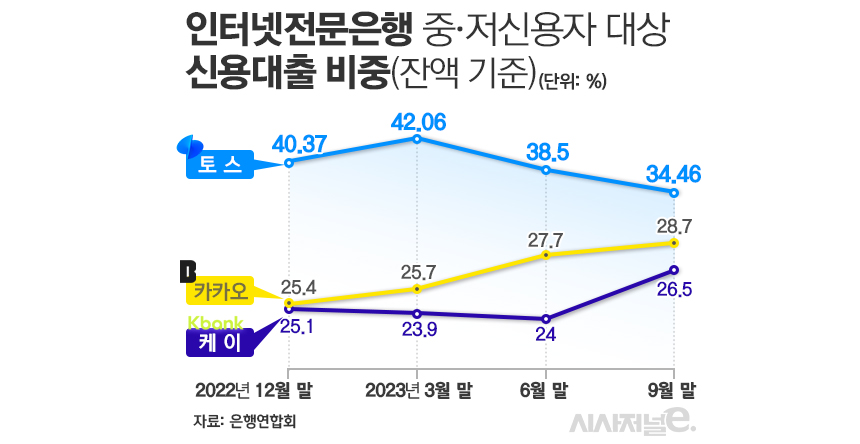 앞서 인터넷전문은행은 금융당국에 제출한 인가 계획에서 기존 금융권에서 소외됐던 중·저신용자들에 대한 신용 공급 확대를 약속했다. 토스뱅크는 올해 말까지 이 비중을 최소 44%까지 끌어올리기로 약속했으며 케이뱅크는 32%, 카카오뱅크는 30%를 목표치로 설정했다. 토스뱅크가 연말까지 44%를 달성하기 위해 올해 4분기에만 이 비중을 10%포인트 가까이 끌어올려야 한다.