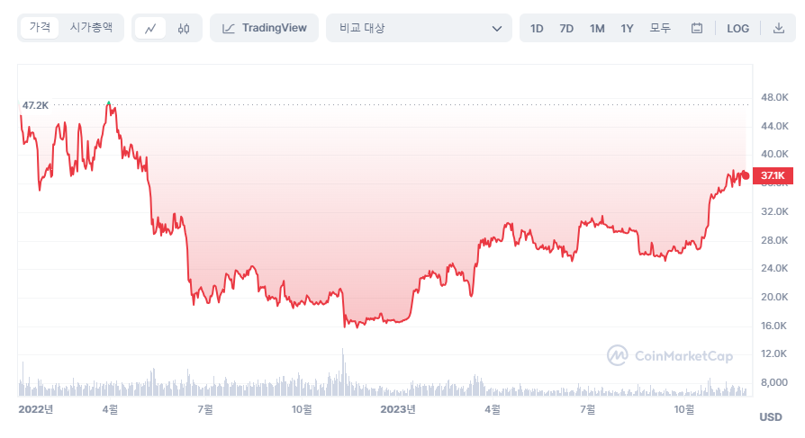 28일 글로벌 가상자산 시황사이트 코인마켓캡에 따르면 이날 오후 4시 비트코인은 3만7112달러(약 4806만원)를 기록했다. 지난해 5월 이후 약 1년 7개월 만에 3만7000달러선으로 올라섰다. 비트코인은 작년 하반기 이후 올해 9월까지 3만달러를 밑돌며 부진했다. 하지만 10월 중순부터 오름세를 타기 시작해 이달 25일 오전 3만8000달러선을 돌파하기도 했다.