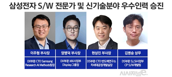 DX(디바이스 경험)부문에서 인공지능(AI) 알고리즘 설계 전문가인 이주형 CTO 삼성리서치 AI Methods팀장과 양병덕 MX(모바일 경험)부문 디스플레이그룹장이 부사장으로 승진했다. 이 부사장은 자체 생성형 언어·코드 모델 개발을 비롯해 선행연구와 전략방향 수립을 주도하며 제품과 서비스 경쟁력 강화에 기여했으며, 양 부사장은 스마트폰 디스플레이 신기술인 펀치홀, UDC(언더디스플레이카메라)와 폴더블폰 S펜 솔루션 등을 주도했다는 평가다.