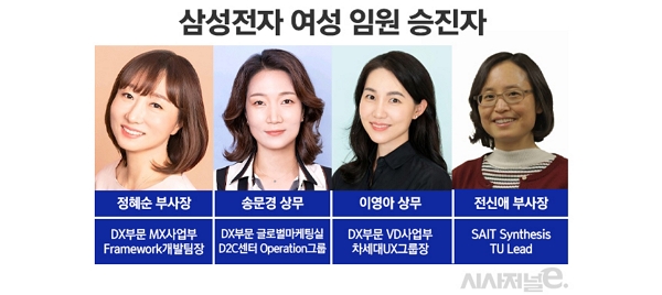 여성 임원은 총 4명이 승진했다. 정혜순 DX부문 MX사업부 프레임웍개발팀장과 전신애 SAIT Synthesis TU 리드 가 부사장으로, 송문경 DX부문 글로벌마케팅실 D2C센터 오퍼레이션 그룹장과 이영아 DX부문 VD사업부 차세대UX그룹장이 상무로 승진했다.