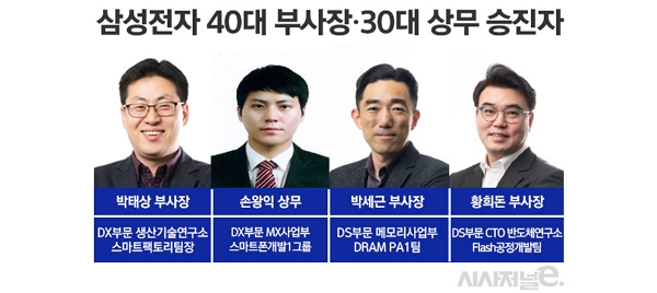 40대 부사장으로는 박태상 DX부문 생산기술연구소 스마트팩토리팀장(부사장, 48세)과 박세근 DS부문 메모리사업부 DRAM PA1팀 부사장(49세), 황희돈 CTO 반도체연구소 플래시공정개발팀 부사장(49세)이 승진했다. 박태상 부사장은 폴더블 등 전략제품에 적용된 부품 개발 및 기술고도화를 이끌었으며, 박세근 부사장은 세계 최초 12나노급 D램 양산 및 현존 최대 용량의 DDR5 개발에 기여했다는 평가다. 황 부사장 또한 신공정 개발과 불량개선 등을 통해 9세대 V낸드 완성도를 높이는 데 이바지했다.