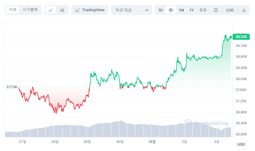 [시사저널e=유길연 기자] 비트코인이 이번 주(11월 27일~12월 3일)에도 상승세를 이어가 20개월 만에 3만9000달러(약 5066만원)선을 돌파했다. 미국 중앙은행 연방준비제도(Fed·연준)가 향후 금리를 내릴 수 있다는 기대가 커진 영향으로 풀이된다. 더구나 비트코인 현물 상장지수펀드(ETF)의 승인 가능성과 내년 예정된 반감기도 시세 상승을 여전히 이끌고 있는 것으로 분석된다.