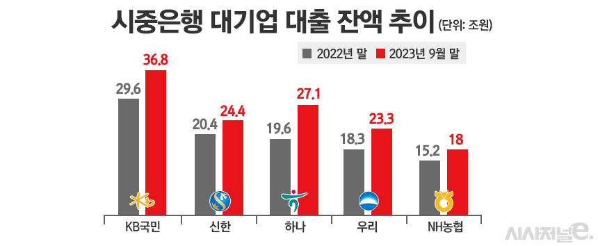 그 결과 올해 5대 시중은행(KB국민·신한·하나·우리·NH농협)의 대기업 대출은 크게 불어났다. 지난 9월 말 기준 5대 은행의 대기업대출 총 잔액은 약 151조원으로 작년 말과 비교해 50% 급증한 것이다. 더구나 지난 9월 우리은행이 ‘기업금융 명가 재건’을 선언하고 ‘영업 드라이브’를 걸었기에 대기업 대출 확보를 위한 쟁탈전은 더욱 심화될 것으로 전망된다. 일각에선 출혈경쟁에 대한 우려도 나온다.