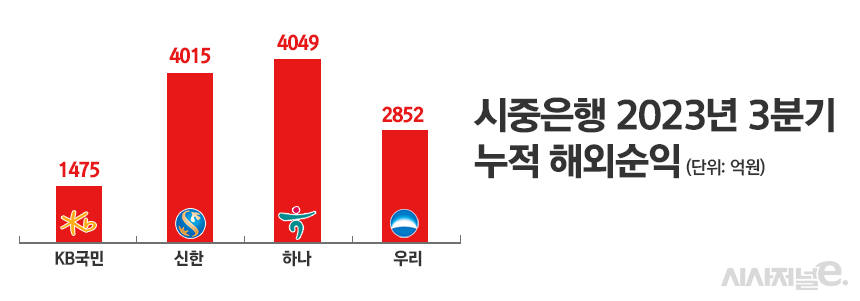 그런데 국내 시중은행의 전체 순익에서 글로벌 부문이 차지는 비중은 아직 낮다. 올해 3분기 누적 기준 글로벌 순익(4049억원) 1위를 차지한 하나은행도 전체 순익 중 글로벌 비중은 약 15%에 그쳤다. 신한·우리은행도 10% 수준에 머물렀으며 국민·NH농협은행은 한 자리수 비중에 불과했다. 그만큼 해외에서 할 일이 더 많다는 의미다.