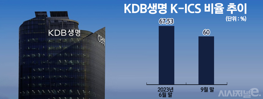 4일 금융권에 따르면 KDB생명의 지난해 9월 말 기준 킥스는 60%로 직전 분기인 6월 말 대비 7.53%포인트 하락했다. 법정 하한선인 100%에 한참 미치지 못한 수준이다. 킥스의 일부 위험 항목 도입을 유예해주는 경과조치를 시행한 값도 6.64%포인트 내린 134.05%를 기록했다.