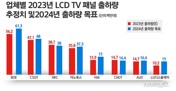 글로벌 LCD 시장 점유율 1위인 중국업체 BOE는 올해 LCD TV 패널 목표 출하량을 전년(5620만대) 대비 9.1% 증가한 6130만대로 설정했다. BOE는 현재 40인치 및 60인치대 패널을 추가해 라인업을 확장 중인 것으로 전해진다.