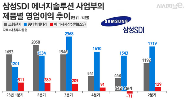 [시사저널e=유호승 기자] 삼성SDI의 에너지솔루션 부문이 생산하는 배터리 제품 판매량 및 성적이 업황에 따라 엇갈리고 있다. 중·대형 배터리는 선방하고 있지만, 소형 전지 및 에너지저장장치(ESS)는 주춤하다. 같은 사업 부문이지만 해당 제품을 사용하는 전방 산업의 업황에 따라 실적이 달라지고 있다.