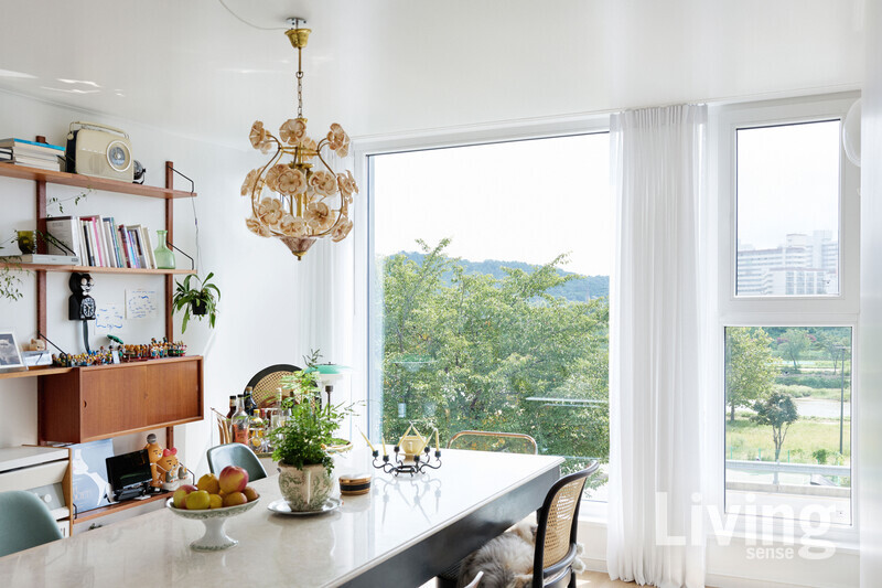 벚나무가 잘 보이는 높이와 위치까지 세세히 따져가면서 매물이 나올 때를 기다렸다. 오로지 ‘뷰’ 하나로 거처를 결정한 만큼 시야를 최대한 확보하는 일이 1순위였다. 거실과 침실의 창호와 새시는 가능한 깨끗하고 넓게 설치하고, 난간도 제거했다. “유리에 코팅을 하면 색감이 조금 바뀔 수 있어서, 일부러 코팅도 하지 않았어요. 투명한 상태 그대로의 생유리로 설치했죠. 대신 사생활을 포기했네요(웃음).” 뷰에 반해 계약하긴 했지만, 문제는 생각보다 협소한 공간이었다. 어떻게 하면 좁은 느낌을 최소화하할지 고민한 끝에, 거실은 서재 겸 다이닝 룸으로 용도를 정했다. 거실을 다목적으로 활용하기 위해 선택한 메인 가구는 로얄시스템의 월 선반 시스템. 부부는 집 의 특정한 콘셉트를 따로 정해 놓지 않았다.