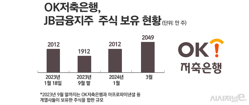 12일 금융권에 따르면 OK저축은행은 이달 4~7일 동안 장내에서 JB금융 주식 36만6860주(약 48억원 어치)를 매입했다고 공시했다. JB금융 지분율도 10.21%에서 10.50%로 0.29%포인트 올랐다. OK저축은행은 지난해 3분기에 JB금융 지분 약 96만주를 대거 처분했지만 4분기에 다시 사들였고 이번에도 추가로 늘렸다.
