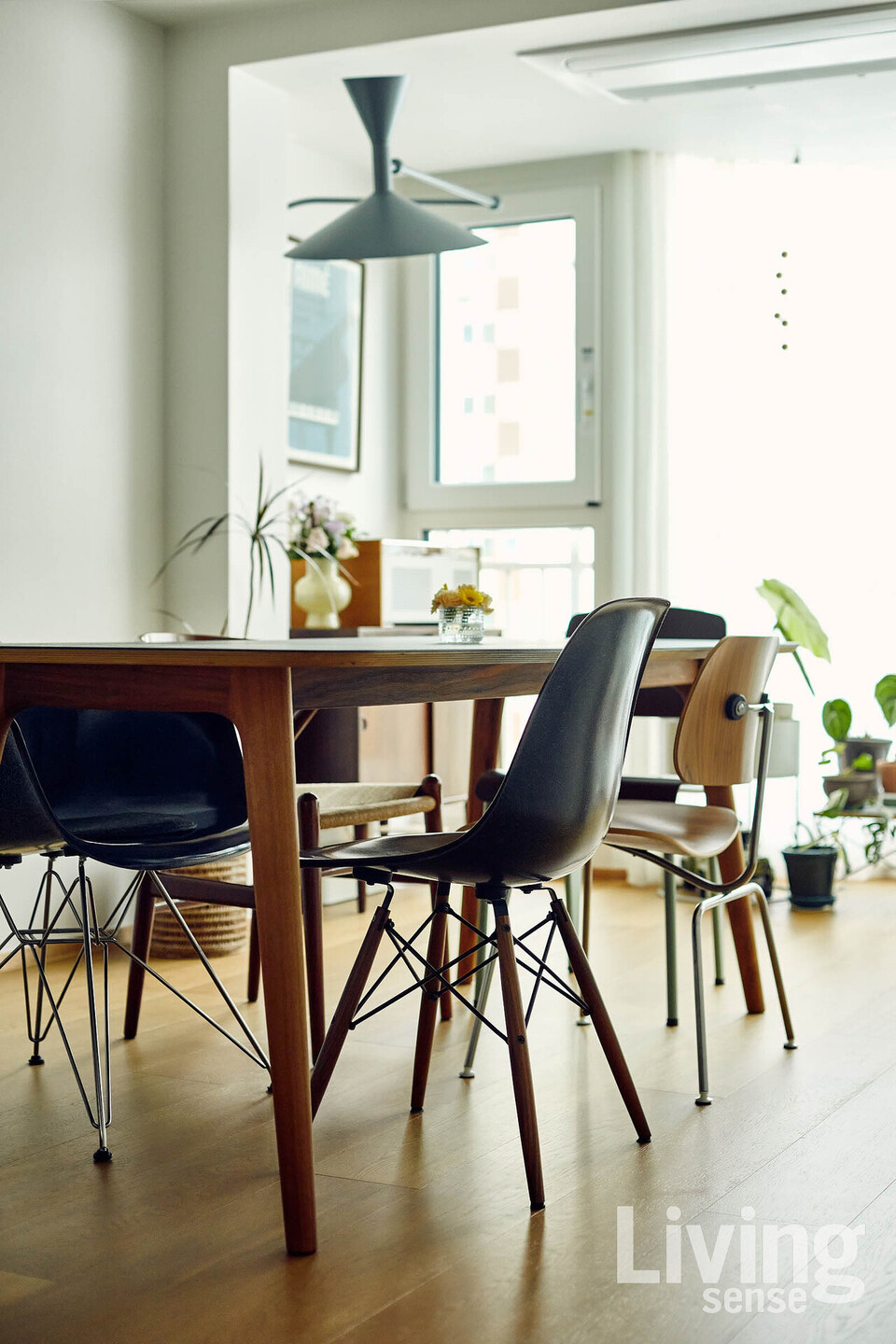 베르네 팬톤, 한스 웨그너, 장 프루베, 임스 부부, 르 코르 뷔지에까지. 가구에 조금이라도 관심을 뒀다면 알 법한 이름의 거장들이 디자인한 오리지널 가구로 알차게 채운 남산 자락의 20평대 아파트. 화려한 컬렉션을 자랑하는 이 집에서 결혼 6년 차 김슬기·강기산 씨 부부가 여섯 살 된 반려견 칸쵸와 함께 살고 있다. 김슬기 씨는 가구디자인 전공자로 졸업 후에는 모던하우스, 자주와 같은 생활용품 브랜드 VMD로 일하며 인테리어 감각을 길러왔다. 그런 그녀가 결혼 초에 들인 조명들 외에 오리지널 디자인 가구까지 본격적으로 수집하기 시작한 건 남편의 제안 덕분이었다. “어느 날 갑자기 남편이 칼한센앤선carlhansen.com에서 한정판 체어가 나왔다고 사보자고 하더라고요. 그렇게시작한 수집이 지금까지 이어진 거죠.” 평소 패션에 관심이 많던 남편이 운동화를 수집하며 기른 디깅력이 가구 컬렉팅에서도 유용하게 쓰인 것이다. 이후에도 남편의 눈에 띈 아이템을 구매할지 말지를 아내가 한 번 더 신중하게 고민해 보는 식으로 지금의 컬렉션을 완성해 왔다. 그러는 한편, 가구와 조명을 아내가 2022년부터 집스타그램 계정@casa_t.d.k에 공유하기 시작하면서 자연스레 부부가 집에 들이는 시간과 돈, 애정도 서서히 깊어졌다. 남편은 한스 웨그너의 의자를 사보자고 제안했던 그때처럼, 아내와 컬렉팅에 대한 의견을 나누는 일을 진심으로 즐기며 해외출장 시에도 부지런히 가구 쇼룸을 들르고 있다. 김슬기씨는 이곳에서의 일상을 인스타그램에서 공유할 예정이다.