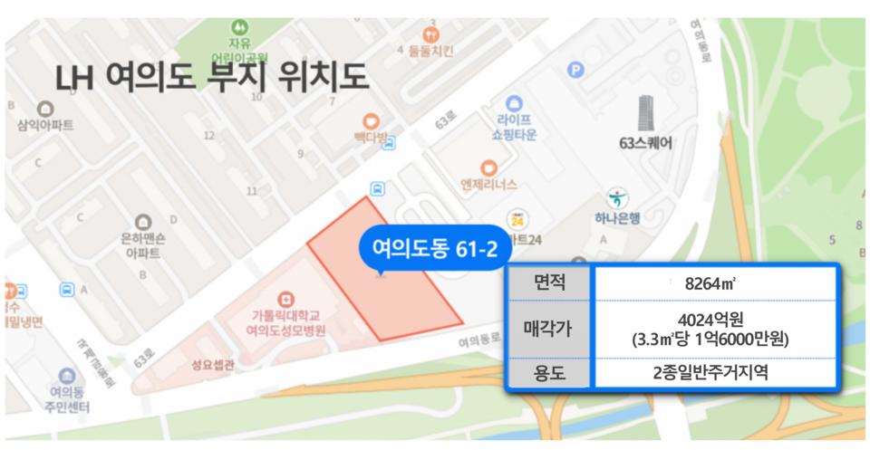 [시사저널e=길해성 기자] 최근 여의도에 개발 열기가 달아오른 가운데 한국토지주택공사(LH)가 여의도 성모병원 인근 부지 매각에 나서면서 건설업계의 이목이 집중되고 있다. 여의도에서 마지막 금싸라기 땅으로 불리는 만큼 건설사들의 치열한 경쟁이 예상된다. 다만 4000억원이 넘는 높은 매각가는 변수로 꼽힌다.