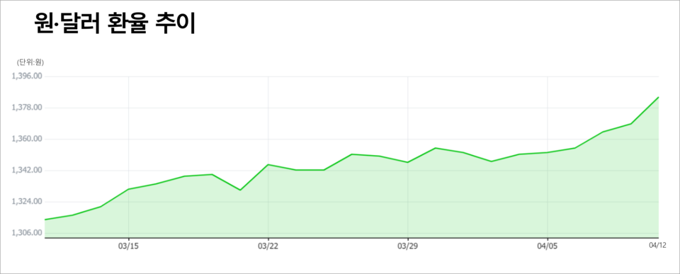 달러 대비 원화 환율은 어제(13일) 역외 시장에서 15원 넘게 폭등하며 1385원을 돌파했다. 12일 서울 외환시장에선 전거래일 대비 11.3원 오른 1375.4원에 거래를 마쳤다. 2022년 11월 10일(1377.5원) 이후 17개월 만에 가장 높은 수준이다. 주간 상승폭 역시 지난 1월 19일(25.5원) 이후 가장 컸다.