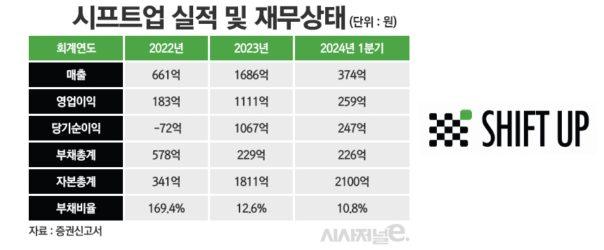 시프트업은 지난해 매출 1686억원, 영업이익 1111억원, 당기순이익 1067억원을 냈다. 올해 1분기에도 매출 374억원, 영업이익 259억원, 당기순이익 247억원을 기록했다. 올해 1분기말 기준 부채비율은 10.8%에 불과하다.