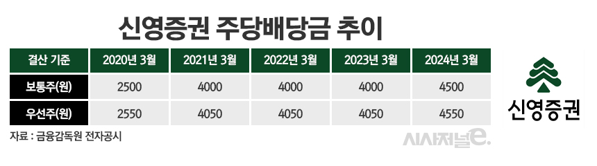 신영증권의 주당 배당금은 3년 만에 인상된 것이다. 앞서 신영증권의 주당 배당금은 보통주 기준 지난 2020년 2500원에서 2021년 4000원으로 올랐고 2022년과 2023년에는 주당 4000원이 유지됐다.