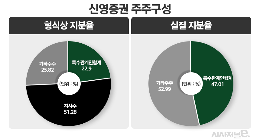 결과적으로 신영증권이 자사주를 소각하지 않는 이상 원 회장 등 오너일가는 보유지분율 대비 2배 이상의 실질의결권과 배당금을 받을 수 있는 구조가 지속되는 셈이다.