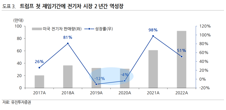 한병화 유진투자증권 연구원은 “만약 트럼프가 당선된다면 그의 재임 기간내의 전기차 판매는 추가적으로 낮아질 것”이라며 “과거 트럼프 1기 때 연비규제의 사실상 폐지 효과로 2019년부터 2020년까지 전기차 판매량이 2년간이나 역성장했다”고 분석했다.