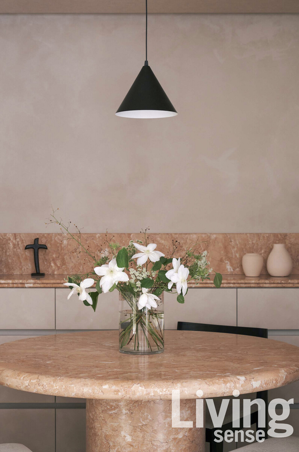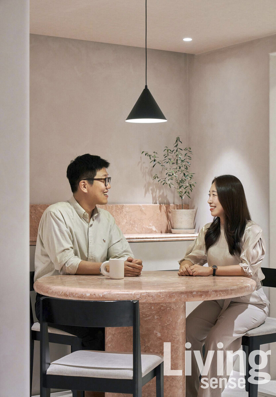 부부는 결혼 전 50일간 유럽 여행을 다녀왔다. “여행 중에 남편에게 프러포즈를 받았어요(웃음).” 사랑을 다시 확인한 순간이자, 둘 다 퇴사 후 떠난 여행이었던 만큼 서로에게는 그 시간이 참 소중했다. 특히 이탈리아 베네치아에서 묵었던 유럽식 가정집은 인테리어 디자이너인 아내에게 다양한 영감을 던져줬다. “유럽은 아무래도 오래된 집이 많잖아요. 겉으로는 낡아 보이는 곳도 문을 열고 들어서면 천연 대리석으로 인테리어를 멋스럽게 꾸며놓았더라고요.“ 그때 느낀 감성을 담는다면, 매일 삶이 여행 같지 않을까라는 생각으로 신혼집의 콘셉트를 '유러피언 클래식 빈티지’로 잡았다는 최소영 씨. 지금 부부가 살고 있는 곳도 30년 이상된 구축 빌라로 오래된 유럽 건물을 연상시키는 면이 있다. “보통 고객 집을 디자인할 때는 컬러로 포인트를 주기보다 내추럴하게 가요.“ 하지만 이곳은 붉은색 벽돌로 된 외관에서 받은 인상을 실내로도 끌어 오고 싶었다. 그렇게 유럽 가정집에서 많이 볼 수 있는 천연석에, 붉은기를 머금은 핑크색이 더해져 지금의 인테리어가 완성됐다. 천장과 벽 등이 기울어져 있다는 걸 고려해 벽 모서리도 반듯하게 처리하기보다는 둥글게 마감했다. “인테리어 철학 중 하나인데 공간에서 그림을 걸 수 있는 벽은 반드시 세팅합니다.“ 빈 벽에 그림이 걸리자 비로소 집이 완성됐다. 이처럼 원하는 바를 모두 시도할 수 있었던 건 군말 없이 지지해 준 남편 덕분. 그렇게 삭막하던 빨간 벽돌집은 아내 최소영 씨를 만나 여행지의 추억을 담을 부부만의 설렘 가득한 공간이 되었다.
