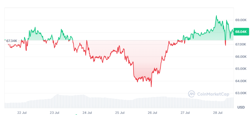 28일 글로벌 가상자산 시황 사이트 코인마켓캡에 따르면 이날 오전 10시 30분 비트코인은 6만8130달러(약 9439만원)로 일주일 전과 비교해 1.36% 올랐다. 22일엔 6만7500달러 선에서 횡보세를 보이다 23일 오후부터 하락하더니 26일 오전 6만3500달러까지 내려갔다. 하지만 이후 급등해 28일 오전 6만9371달러까지 상승했다. 그러다 소폭 내리면서 현재 6만8000달러선에서 거래되고 있다.