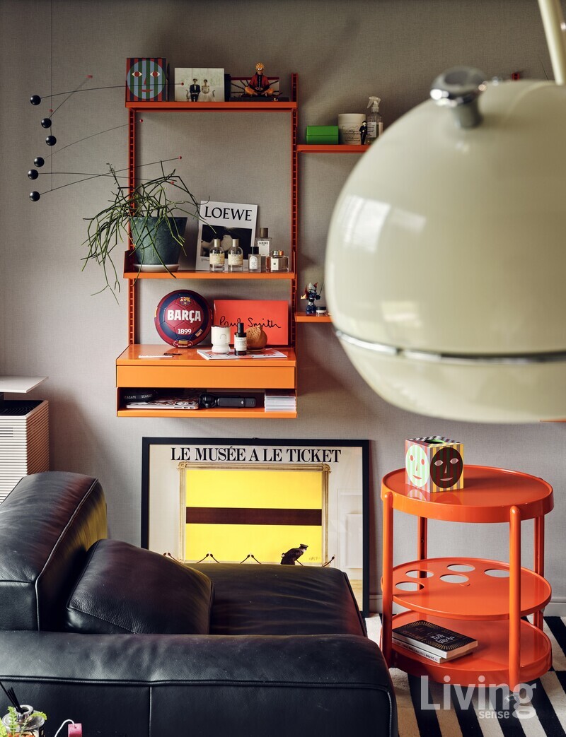 프리랜서 브랜딩 기획자인 장민주 씨. 한때 렌털 스튜디오까지 운영했던 그녀는, 공간이든 브랜드든 더 감각적으로 바꾸는 소질이 있다. 신혼집에서도 손그림과 이미지 합성을 겸하며 구상한 이미지를 시각화하는 걸 즐겼던 민주 씨. 공간을 연출할 때 그녀만의 또 하나 습관은, 메인이 되는 컬러를 먼저 지정한 뒤 그에 어울리는 것들로 나머지를 채워가는 것이다. 그건 지금 집에서도 마찬가지. 다만 부부가 이사 올 집을 처음 보게 되었을 때는 내심 당혹함을 감추지 못했다. 부엌 하부장부터 시작해 공간의 많은 부분을 요즘 인테리어 트렌드에서는 잘 쓰지 않는 그레이가 차지하고 있었던 것. 하지만 전면 리모델링을 하기에는 신축 아파트라는 점이 마음에 걸렸다. 결국 복도의 팬트리와 중문처럼 공간의 일부분만 세련된 무광 블랙 컬러로 바꾸기로 결정했다. 집에 블랙을 더한다고 시공을 도와주는 사장님은 연신 의문을 표했지만, 결과적으로 그녀의 선택은 옳았다. 공간에 선명한 블랙이 더해지니 칙칙한 그레이의 존재감이 한껏 덜어진 것. 그 덕에 큰 공사 없이도 민주 씨네 집은 한층 세련되게 변모했다. 블랙 외에 또 하나 공간에서 두드러진 컬러는 거실 선반의 쨍한 오렌지색. 민주 씨가 레어로우 쇼룸에 갔을 때 한눈에 반해 골라온 제품이다. “처음에는 무난한 화이트 컬러를 생각하고 쇼룸을 갔어요. 그런데 보자마자 이 오렌지 컬러에 한눈에 반했죠. 남편은 반대했지만요(웃음).“ 일반적인 집보다 강렬한 색을 많이 가미한 민주 씨의 집이지만, 그게 부담스럽다거나 눈이 아프게 느껴지지 않는다. 바로 쨍한 컬러 주변에 무채색 컬러가 녹아져 있기 때문이다. “아들 친구들이 이런 말을 자주 한대요. ‘로아 집 멋지잖아’라고. 우리 집보다 비싼 가구를 둔 집은 많지만, 정형화된 인테리어가 아니라는 점이 좋아 보였나 봐요.” 솔직한 아이들의 눈에 그렇게 보였다면 그녀의 집은 컬러를 제대로 쓴 성공 사례다.