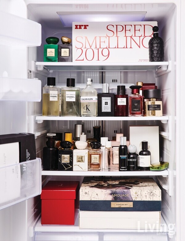 제가 쓰는 향수들은 다 냉장고에 보관해요. 향수는 어둡고 시원한 곳에 보관하는 게 좋거든요. 새로운 제품이 나오면 실험해 보는 걸 좋아해서 향수가 많은 편이에요. 그래서 냉장고가 음식 대신 향수로 가득 차 있어요.