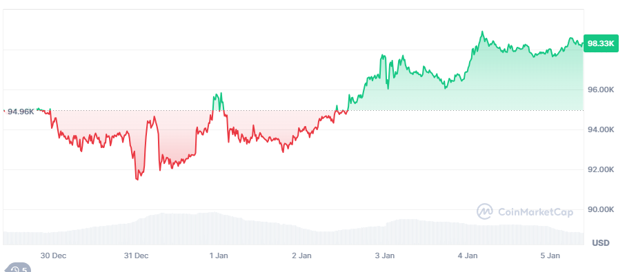 5일 글로벌 가상자산 시황 사이트 코인마켓캡에 따르면 이날 오전 8시 55분 비트코인은 9만8263달러(약 1억4464만원)로 일주일 전과 비교해 3.24% 상승했다. 지난주말 9만5000달러선에서 거래되던 비트코인은 주초부터 하락하기 시작하더니 지난해 마지막 날 9만1393달러까지 내려갔다. 하지만 이달 2일부터 반등해 현재 9만8000달러선에서 거래되고 있다.