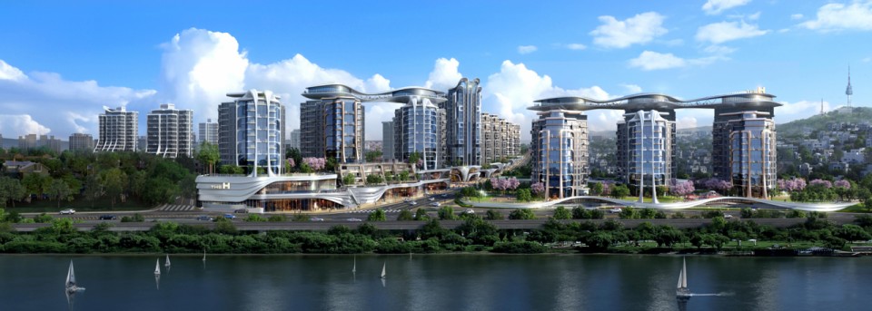 반면 현대건설은 한강뿐 아니라 남산, 용산공원 등 다양한 조망권을 확보할 수 있는 설계안을 제시했다. 설계안을 살펴보면 세계적 건축사무소 자하 하디드와 협업한 곡선형 설계를 전면에 내세웠다. 5개 단지 위엔 300m에 달하는 스카이브릿지(동과 동을 잇는 구름다리)가 배치한다. 이를 통해 한강·남산·용산 등을 360도로 조망이 가능해진. 다만 한강 조망 가구 수는 849가구로 조합안보다 20% 적다. 단지명은 ‘디에이치 한강’이다. 현대건설 관계자는 “한강의 곡선과 남산의 자연미, 넓게 펼쳐진 공원 등을 조화롭게 담아내며 한강변 새로운 랜드마크를 건설하겠다”고 말했다.